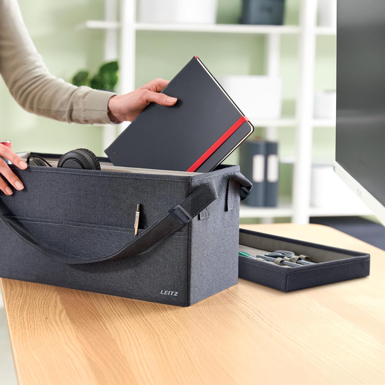 The Leitz Desk Sharing work bag with lid impresses with style, functionality and sustainability. It is suitable for the office, home office or school. With its three spacious compartments, it offers space for all important work utensils such as laptops up to 16 inches, keyboard, mouse, charging cable, headset, notebook and water bottle. It supports up to 8 kg. The removable lid protects the contents from dust and prying eyes, which is particularly beneficial in offices or shared offices. The organizer is made from 57% recycled material and is 98% recyclable. Recycled cardboard reinforcements ensure stability and durability. Two adjustable carry handles (15-45cm) allow for comfortable carrying by hand or over the shoulder. The bag is suitable for men and women alike. Thanks to its foldable design, the office bag can be stowed away to save space. The matte, velvet grey look gives it an elegant touch and makes it a stylish companion in everyday life.