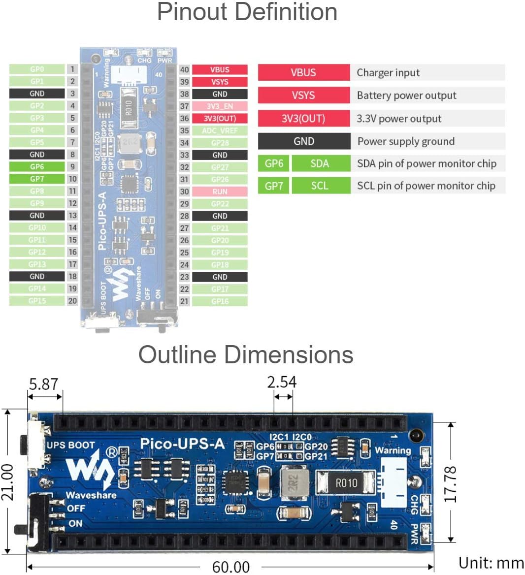 OverviewThe Pico-UPS-A is a dedicated UPS (Uninterruptible Power Supply) module designed for Raspberry Pi Pico. It incorporates Li-ion battery switching charger with power path management, and voltage/current monitoring chip, allows monitoring the battery operating status via I2C bus.1.Uninterruptible Power Supply For PicoKeeps Your Pico Running While Recharging, Monitoring Battery Status Via I2C2.Raspberry Pi Pico Header CompatibilityOnboard Female Pin Header For Direct Attaching To Raspberry Pi PicoSpecificationsRECHARGE VOLTAGE--5VCONTROL BUS--I2CBATTERY SUPPORT--14500 Li-ion battery (NOT included)DIMENSIONS--60 × 21mmWhat's On Board1.ETA6003recharger chip2.INA219voltage/current monitoring chip3.S8261Li-ion battery protection chip4.FS8205Li-ion battery protection MOS5.AO3400reverse-proof MOS6.SI2305counter current preventing MOS 7.Rapsberry Pi Pico headerfor direct attaching to Raspberry Pi Pico8.Power switchActivate buttonactivate the protection circuit after replacing battery9.14500 battery holderPackage ContentPico-UPS-A x1NoteRaspberry Pi Pico and Li-ion battery are NOT included.Development Resources is provided , please contact us if you have any problem
