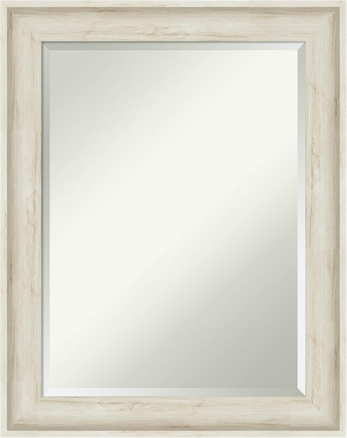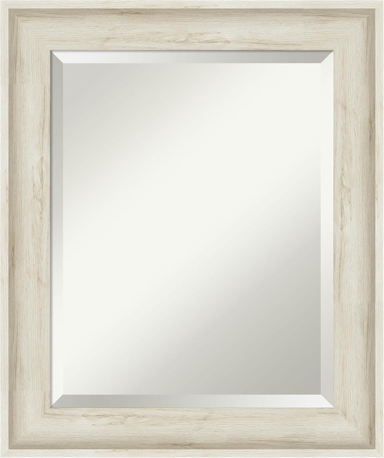 PRODUCT: Amanti Art Beveled Wall Mirror; OUTER SIZE: Exactly 44.75 x 34.75 inches; FRAME: Regal Birch Cream; FRAME FINISH: Distressed; FRAME COLOR: Cream. The Regal Birch Cream frame is a rustic whitewash frame with a high outer edge and dramatic scoop. A beautiful grey wood grain texture shows throughout. Give your home or office the finishing touch with this framed wall mirror. Individually made using traditional custom framing techniques, it has the quality you would expect from your local frame shop. It holds its value with premium finishing that can be appreciated up close. Because of our attention to detail and focus on artistry, architects, interior designers, and homeowners alike choose this mirror to create beautiful living spaces.