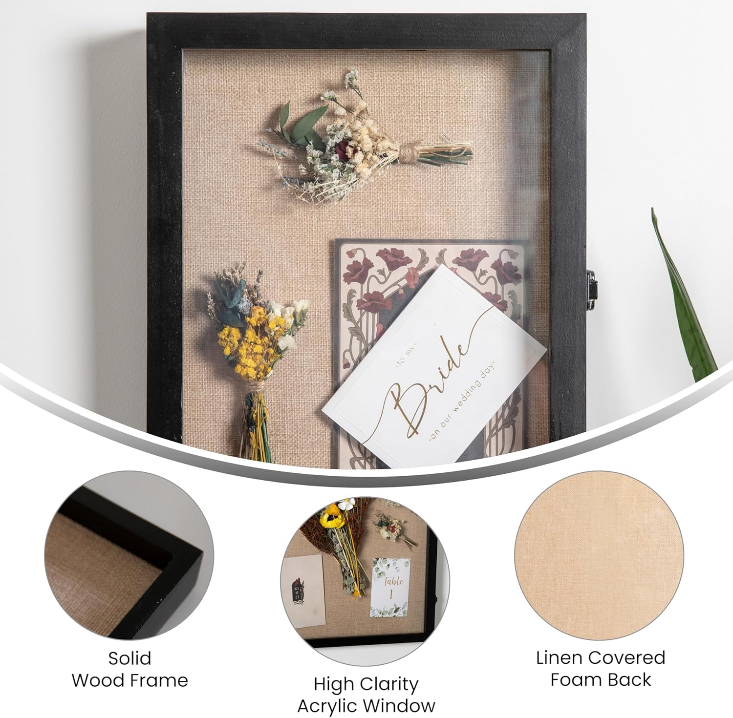 Keep old concert tickets, baby pictures, flowers from your first date and other memorabilia proudly displayed and free from dust or damage when you purchase this 11x14 shadow box display case with 8 included push pins. Fronted by a high clarity acrylic window backed by a foam board with a beautiful linen overlay, your mementos will always look great. Constructed from solid pine wood, available in multiple finishes, this display case features a powder coated lock for and hinges for safety as well as easy access. This display frame shadow box can sit on any level surface or be wall mounted and comes with a saw tooth hanger already installed as well as the hanging hardware. Perfect for gift giving, you can offer as a blank space for upcoming memories, or fill with items from your shared past for a sweet, thoughtful wedding, baby shower, or anniversary gift for your loved ones. Wipe the wooden frame clean with a dry cloth and use a neutral cleaner on the acrylic window to maintain the appearance of this stunning shadow box.