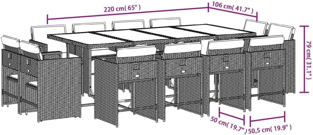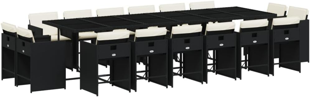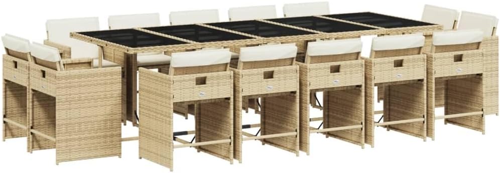 This Large Modern Garden Dining Set is a nice solution for outdoor dining and social gatherings, ideal for family barbecues or festive dinners with friends. Made from strong materials, including UV-resistant PE rattan, it combines style and practicality, creating a relaxed vibe for any outdoor area.Spacious Seating: Enough space for 12 guests, making it great for gatherings. The generous dimensions allow everyone to relax, serving as the centerpiece of your patio.Durable Materials: Made with PE rattan, this set is built to handle the weather and lasts long. You can enjoy your outdoor dining area without worry, even in various weather conditions.Easy Maintenance: Removable and washable cushion covers make cleaning easy—no worries about stains during summer parties.Stylish Design: This dining set adds a modern touch to your outdoor decor. The blend of brown rattan and tempered glass creates a classy and welcoming atmosphere.Convenient Storage: The foldable chairs make it a breeze to store away when not in use, maximizing your outdoor space.Number Of Items: 12Color: BrownMaterial: Synthetic Poly RattanFinish: MatteIndoor/Outdoor: Outdoor OnlyCover Included: NoRoom: Garden and terraceHeadboard Included: NoCapacity: 12-seaterMaximum Weight: 242.5 kgDimensions: 41.7 x 86.6 x 28.7 in (W x L x H)Leg Height: 31.1 cmSeat Depth: 38.1 cmSwings: NoLadder: NoBrand: vidaXLDelivery Contains: 1 x Garden table, 12 x Garden chair, 12 x High-back chair cushionAssembly Required: YesSKU: 3277988EAN: 8721102497315